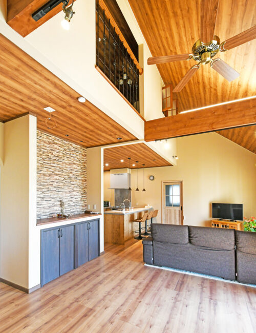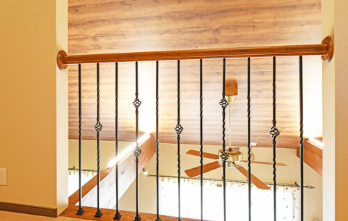 ▲2階の吹き抜け部分の手摺にはオシャレなアイアン飾りを使用。