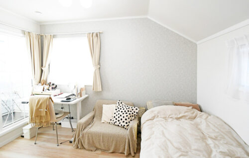 ▲勾配天井がオシャレな優しい雰囲気の洋室