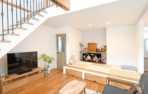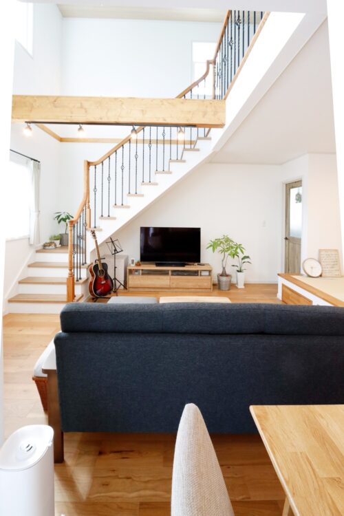 ▲リビングに大きな吹抜けとリビングイン階段♪