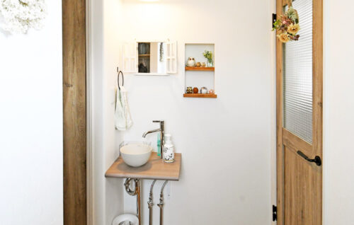 ▲玄関を入ると目の前に造作洗面台を設置♪