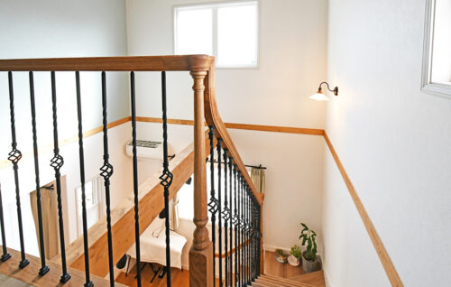 ▲階段はクラシカルなオーク材+アイアンの素敵な手摺がついています