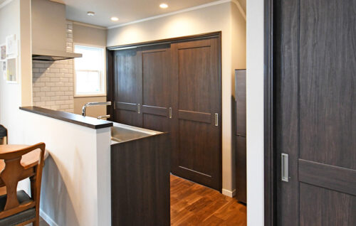 ▲キッチンの後ろは隠せる収納でスッキリ。