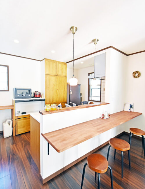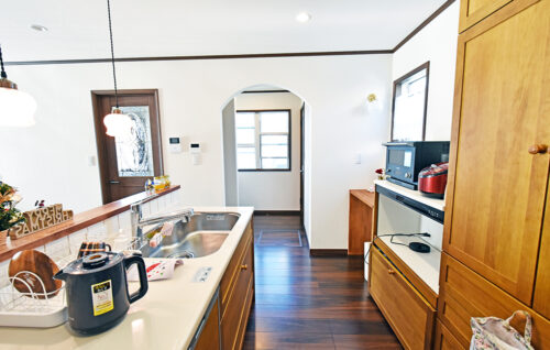 ▲キッチン扉は、床に合わせた茶色の無垢扉