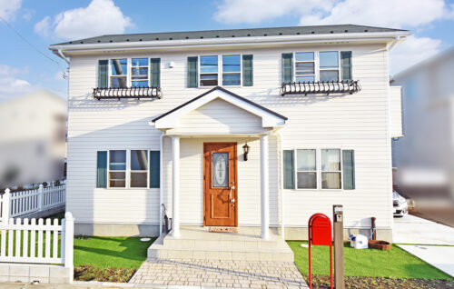 グリーンの屋根と鎧戸がかわいいアメリカンスタイルのお家。