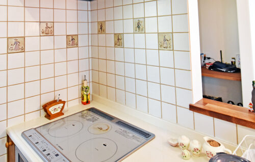 ▲キッチンの壁面タイルにはお施主様ご支給のアクセントタイルを使用