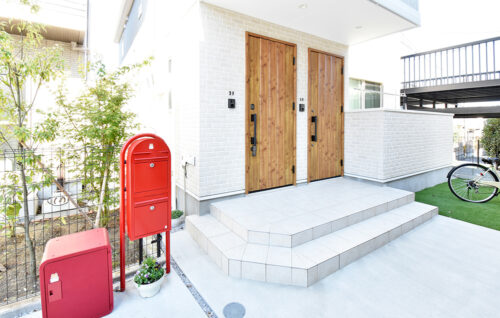 ▲木目調の素材感がかわいいお揃いの玄関ドア