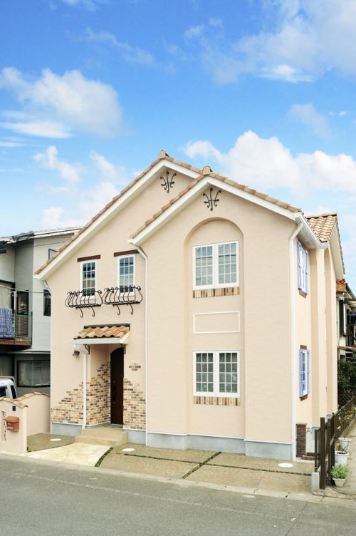 絵本を飛び出したような塗壁と洋瓦の南欧風輸入住宅